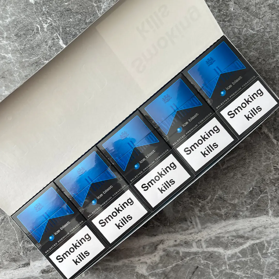 | Packaging | Black hard pack with blue gradient accents, Marlboro chevron, and “Ice Blast” labeling |
